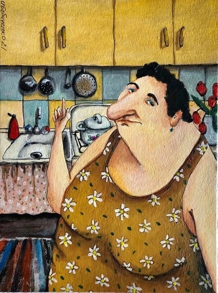 – Та то фигня. Делай меньше огонь и накрывай крышкой. Тааак, шо ещё? Аааа. Сильно крупно режешь оливье. Лара! Ты шо…..сама режешь оливье? Здрасьте. А шо твой муж тада дома делает? Он шо там для мебели? Бери его с собой на кухню и пусть все режет сам. Адиет. Лара, ты слышишь? Тока сильно острый нож ему не давай, порежется. Неделя дежурства на кухне и он будет кушать всё подряд. Недоваренное, недожаренное, недосоленное. И вообще…горячее сырым не бывает. Лара! Не боись. Не реви. Мы его научим Родину любить. Ларочка, деточка запомни….у тебя самая лучшая свекровь в мире. И самый лучший в мире муж. Адиет.